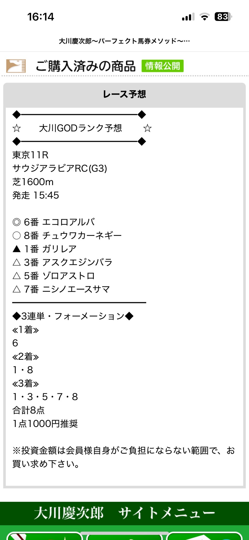 馬帝国管理人のメルマガでもレース当日大川慶次郎の買い目がオススメされていて