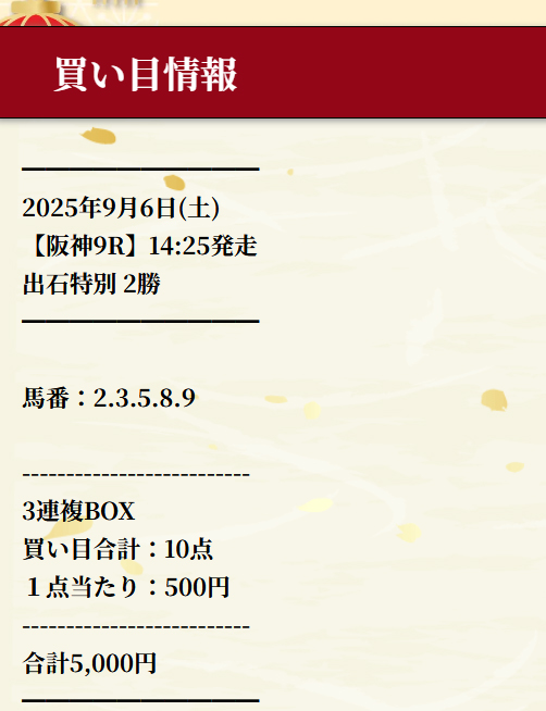 その中で6日(土)の暁の無料予想は馬券代5000円で